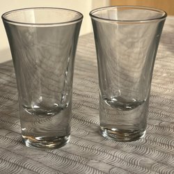 Dessa två klara glas har en elegant design med en bred öppning och en stabil bas. Väldigt tunga.