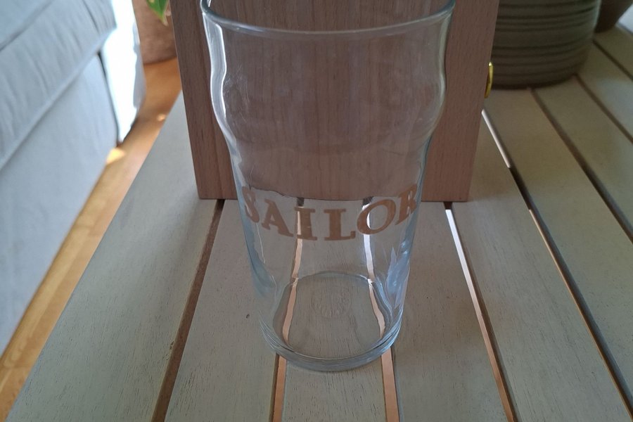Ett ölglas med texten "SAILOR" i guld. Glaset har en klassisk pint form.