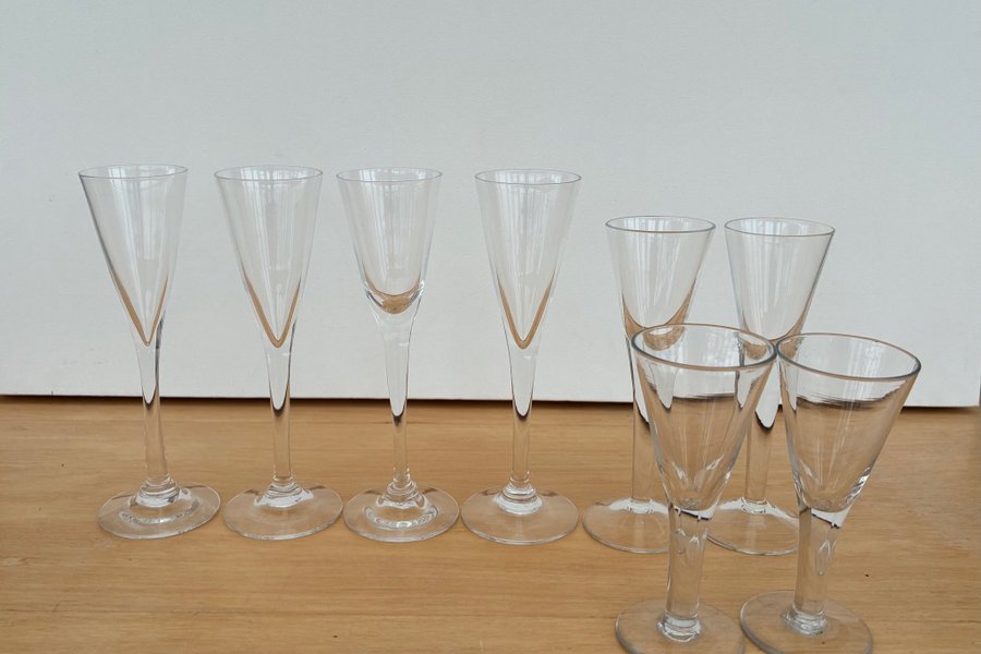 Set med 8 klara snaps glas. Fyra av glasen är högre och har en smalare, avsmalnande form, medan de andra fyra är kortare och bredare. Alla glas har en fot.