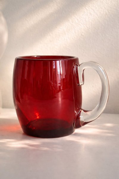 Mugg i rött glas med ett genomskinligt handtag. Vet ej märke men haft denna i minst 25 år. Kvar sedan barndomen.