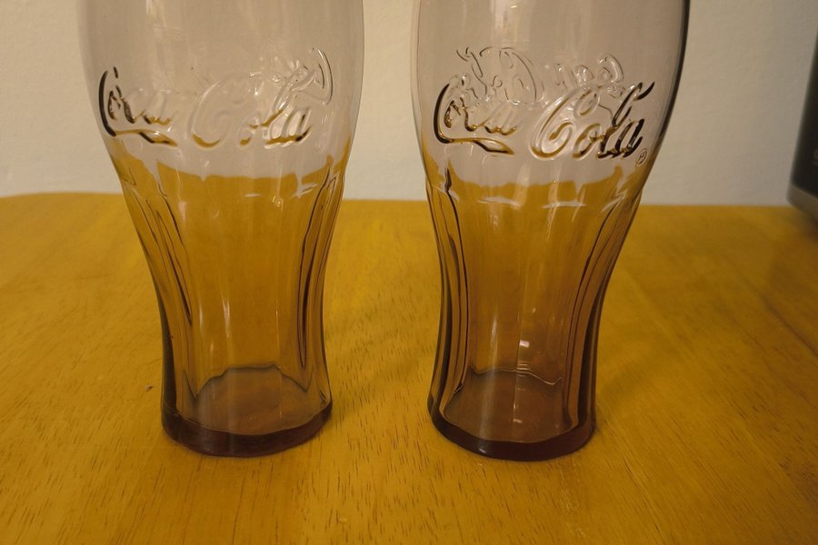 Två stycken Coca-Cola glas i brunt glas. Glasen har den klassiska Coca-Cola logotypen präglad på sidan.