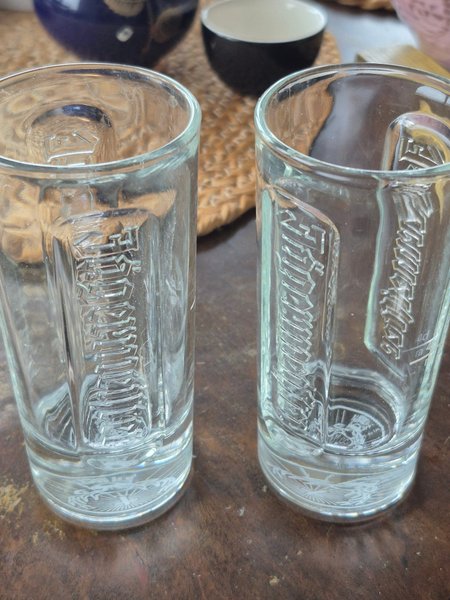Två Jägermeister shotglas med texten "Jägermeister" präglad på sidorna och en detaljerad botten. 12cm