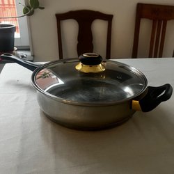 Stekpanna med mässingshandtag. Diameter ca 20 cm. Stekpannan är inte lämplig för induktionshällar.