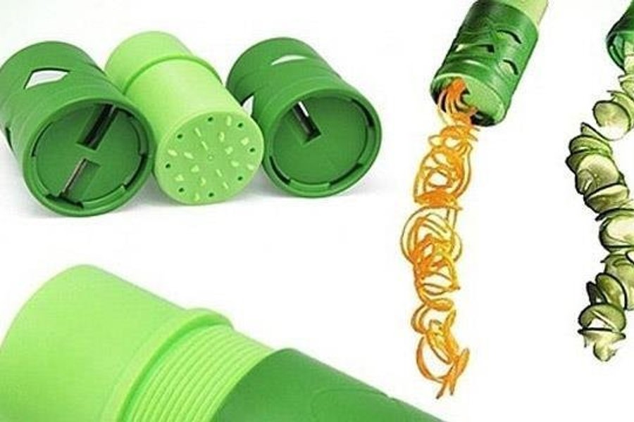 I ena änden har du ett munstycke som gör spiraler och i den andra spaghetti. Stoppa in morötter, potatis, gurka, det mesta går och vrid sedan grönsaksstrimlaren.