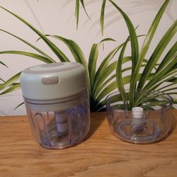 Hackare för köket. Laddas upp med Usb-c kabel och genom att trycka på knappen högst upp hackas grönsakerna automatisk. Endast använd fåtal gånger