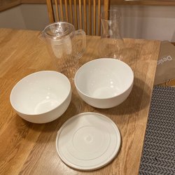 Diverse köksartiklar säljes. Inkluderar bland annat rivjärn, bakformar, visp, slevar och en termos. Tång ingår inte. Köksassistenten är samtidigt en ugn med flera bakprogram och degknådningsfunktion.