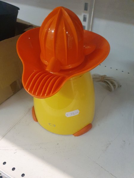 Elektrisk citruspress i gul och orange färg. Perfekt för att pressa apelsiner och andra citrusfrukter.