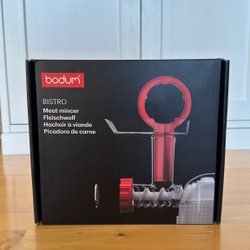 Köttkvarn i metall med vev och fästanordning. Kvarnen är komplett med kniv och hålskiva.