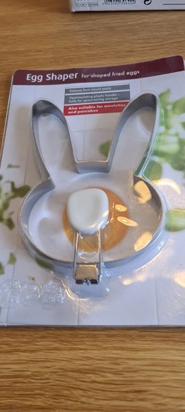 Äggformare för att forma stekta ägg. Kan användas till omeletter och pannkakor. Den har ett värmeisolerande plasthandtag som kan fällas ihop för platsbesparande förvaring.
