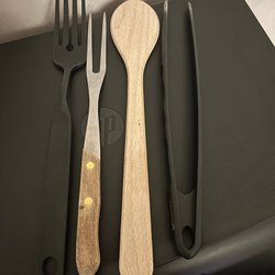 Detta parti innehåller en samling av köksredskap. I partiet ingår sex majshållare, sex långa skedar, tre potatisskalare, en melonkulare, en pizzaskärare, en korkskruv, en trägaffel, och två mindre skedar.