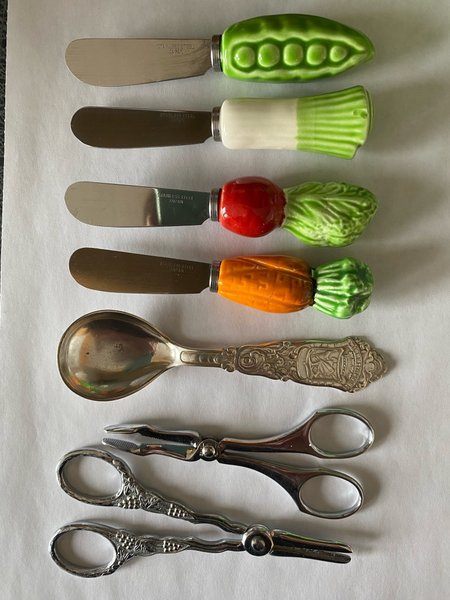 Småknivar till olika smörsorter, Lillehammer samlarsked och sockertång och druvsax i ns.