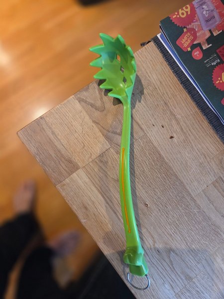 En grön spaghettislev med ett gult mönster på handtaget. Sleven har en praktisk ögla för upphängning.