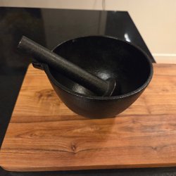 En mortel. Morteln är tillverkad av vit keramik. Perfekt för att krossa kryddor, örter eller andra ingredienser i köket.