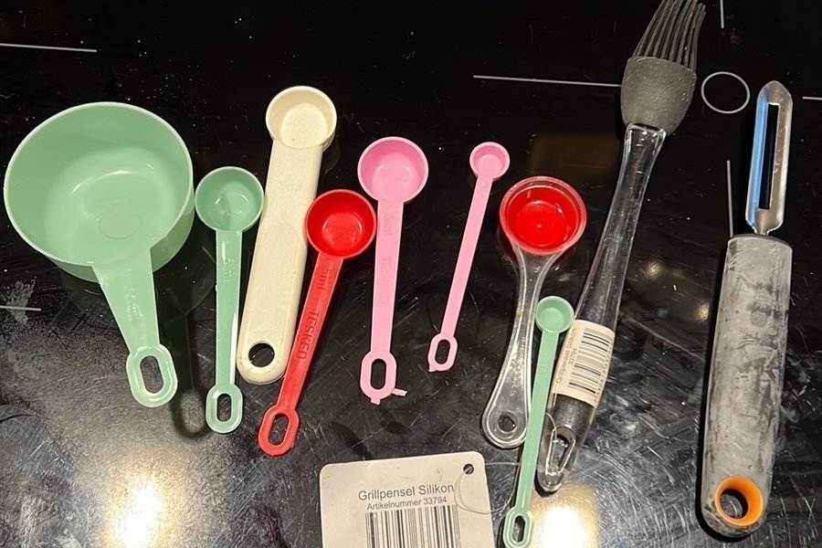 Diverse köksredskap som mått, pensel och potatisskalare.