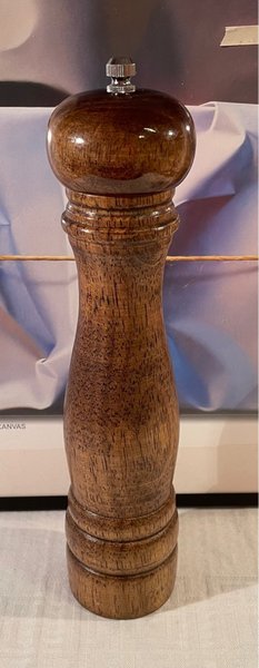 Pepparkvarn i trä med metallknopp. Kvarnen har en klassisk design och är tillverkad av mörkt trä med synliga ådringar. Den har en räfflad metallknopp upptill för justering. Höjd 26cm