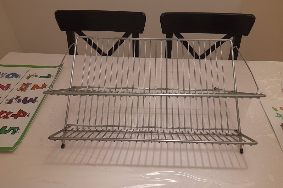 Diskställ i två plan, tillverkat av metall. Praktisk design för att torka disk effektivt.