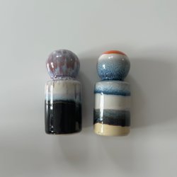 Ett set med salt och pepparkar i glas med blå detaljer. ett lock har en spricka.