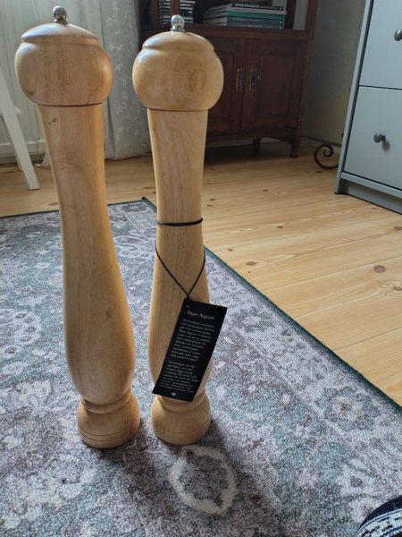 Två pepparkvarnar i trä. Den ena kvarnen har en etikett med information om Piper Nigrum (svartpeppar, vitpeppar och grönpeppar). Tillverkade i bok.