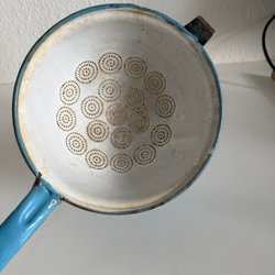 Hulsi i blå emalje. Perfekt til at skumme eller dræne madvarer. Hulsi har en praktisk krog til ophængning. Den er måler Ø cirka 14,5 cm og håndtaget er cirka 31,5cm langt.