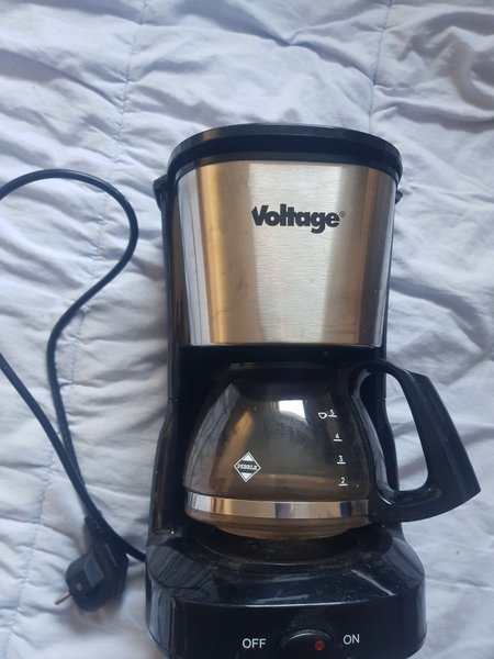 Kaffebryggare från Voltage, modell Pebble. Bryggaren är svart och silverfärgad med en glaskanna. Den har en kapacitet på 5 koppar, vilket indikeras av markeringar på kannan. En strömbrytare för "ON" och "OFF" finns på framsidan. Endast upphämtning i Täby vid Täby centrum. Swish.