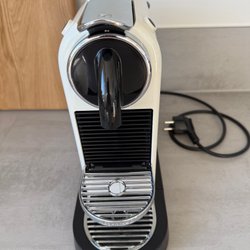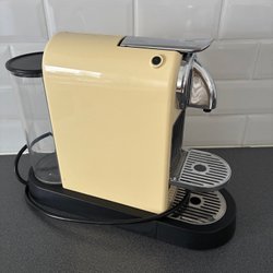 Nespresso kaffemaskin i svart färg. Maskinen har en avtagbar vattentank och en droppbricka i metall. Den har två knappar för olika koppstorlekar. En spak på sidan används för att öppna och stänga kapselhållaren.