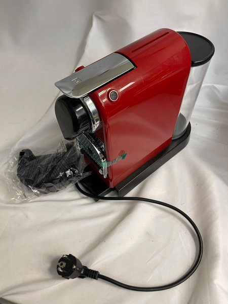 Nespresso kaffemaskin i rött och svart. Maskinen har en avtagbar vattentank och en droppbricka. Strömkabel medföljer.