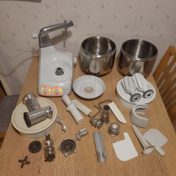 Electrolux Assistent N24 köksmaskin med tillbehör. Modellen är tillverkad i Sverige. Produktnummer 9102810 och serienummer 549 00187.