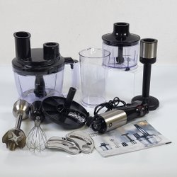 Stavmixer i svart och rött. Denna stavmixer är lämplig för att mixa soppor, såser och smoothies direkt i kastrullen eller behållaren. Den är obetydligt använd.