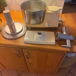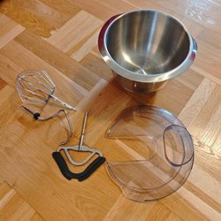 Bosch köksmaskin med en robust design. Maskinen har en skål i rostfritt stål och en visp. Den är utrustad med en motorbas och en strömkabel. Fulltfungera men jag tror sakna lite grejer