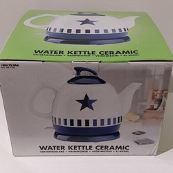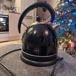 En vattenkokare i rostfritt stål med svart handtag och bas. Perfekt för att snabbt koka vatten till te, kaffe eller andra varma drycker. Kokaren har en liten transportskada den sida som inte har en varningsetikett, jag har kört 2 uppkok och allt fungerade. Volym 1,8 l 15 cm botten och 25 cm hög. Eu kontakt 240 V 1500W.
