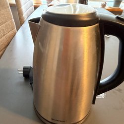 Säljer en vattenkokare. Den är svart med silverfärgad lock. Perfekt för att snabbt koka upp vatten till te eller kaffe.