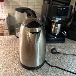 Säljer en vattenkokare. Den är svart med silverfärgad lock. Perfekt för att snabbt koka upp vatten till te eller kaffe.