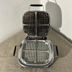 Våffeljärn för att göra våfflor. Våffeljärnet har en non-stick beläggning och gör fyra hjärtformade våfflor åt gången. Den har indikatorlampor för ström och redo att grädda.