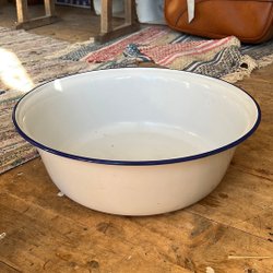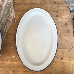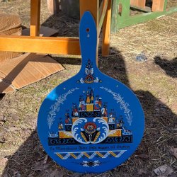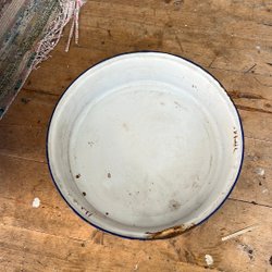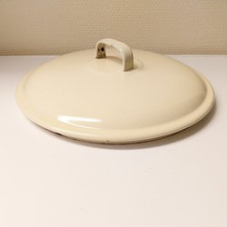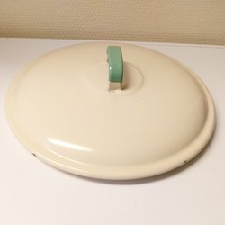 Emaljerat lock i en ljus färg med runda mönster. Locket har två handtag.