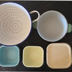 Durkslag från Kockums i emalj. Färgen är gul med grön kant och gröna handtag. Undertill står det "Kockums Sweden 22 cm".