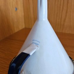 Tratt från Kockums i emalj. Färgen är cremevit med grön kant och handtag.