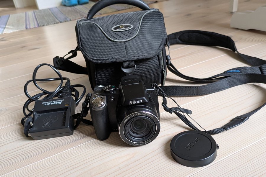 Säljer en Nikon kamera. Objektivet är NIKKOR 18X OPTICAL ZOOM VR 4.7-84.2mm 1:2.8-4.5.