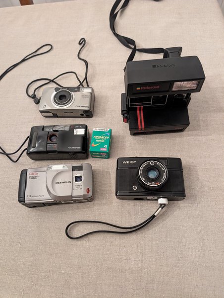 Samling med diverse kameror. Inkluderar bland annat Olympus, Polaroid och Weist.