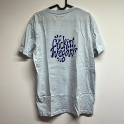 Vit T-shirt med ett V på framsidan och texten ”fuckin’ vegan” på ryggen. Upcyclad och handtryckt av SliceByAlice.