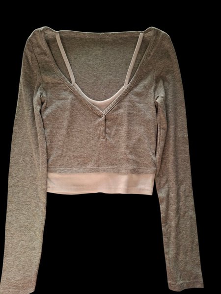 Grå, långärmad tröja med V-ringning och knappar framtill. Tröjan har en vit detalj vid halsen och nederkanten.
