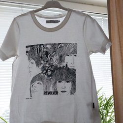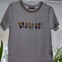 Svart t-shirt med ett mönster av vita katter. T-shirten har korta ärmar.
