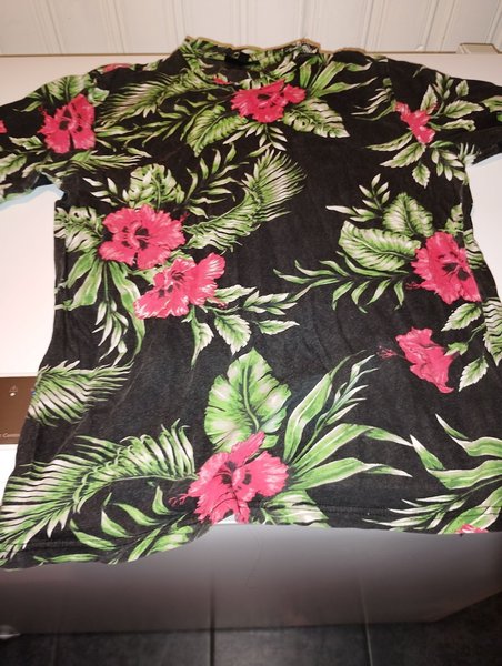 En kortärmad tröja med ett livfullt mönster av röda blommor och gröna blad mot en mörk bakgrund. Tröjan har en rund halsringning.