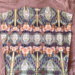 En kortärmad tröja med ett livfullt mönster av röda blommor och gröna blad mot en mörk bakgrund. Tröjan har en rund halsringning.
