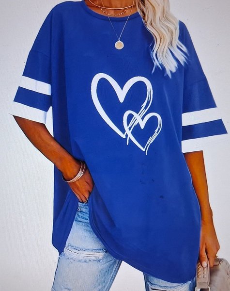 Blå t-shirt med rund halsringning och korta ärmar. Tröjan har vita ränder på ärmarna och ett vitt hjärtmotiv framtill. Passformen är lös och avslappnad.