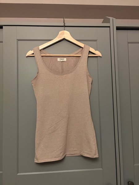 Ett ärmlöst linne i en neutral färg. Den har en rund halsringning och en enkel design.