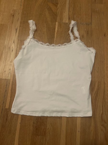 Vitt kortare linne med spetsdetaljer vid halsringningen och axelbanden. Aldrig använt
