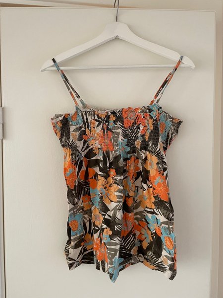 Färgglad sommartopp med smala axelband och smock upptill. Toppen har ett blommigt mönster i orange, blått, svart och vitt.