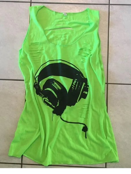 Limegrön ärmlös topp med tryck av hörlurar framtill. Toppen har dekorativa skärningar vid halsen och axlarna, vilket ger den en unik och edgy stil.