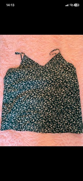 Grönt linne med vita små blommönster. Linnet har tunna axelband och en V-ringad hals.