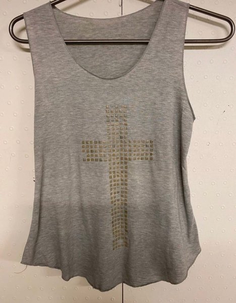 Grått linne med ett korsmotiv framtill, bestående av små fyrkantiga nitar eller stenar. Linnet har en rundad halsringning och ärmlösa axelband. Nederkanten är oregelbunden och rundad.strl S/M